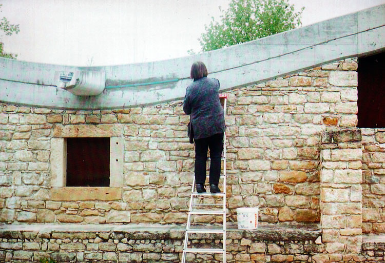 Friedrich Kurrents Geschenk an Maria Bilja-Bilger zu ihrem Gedenktag am 1. Mai 2009: ein türkisfarbenes tönernes SCHMUCKBAND, verfertigt von Milada Zahnhausen, das dem Sommereiner Bau, dem SCHATZHAUS, umgehängt wurde.